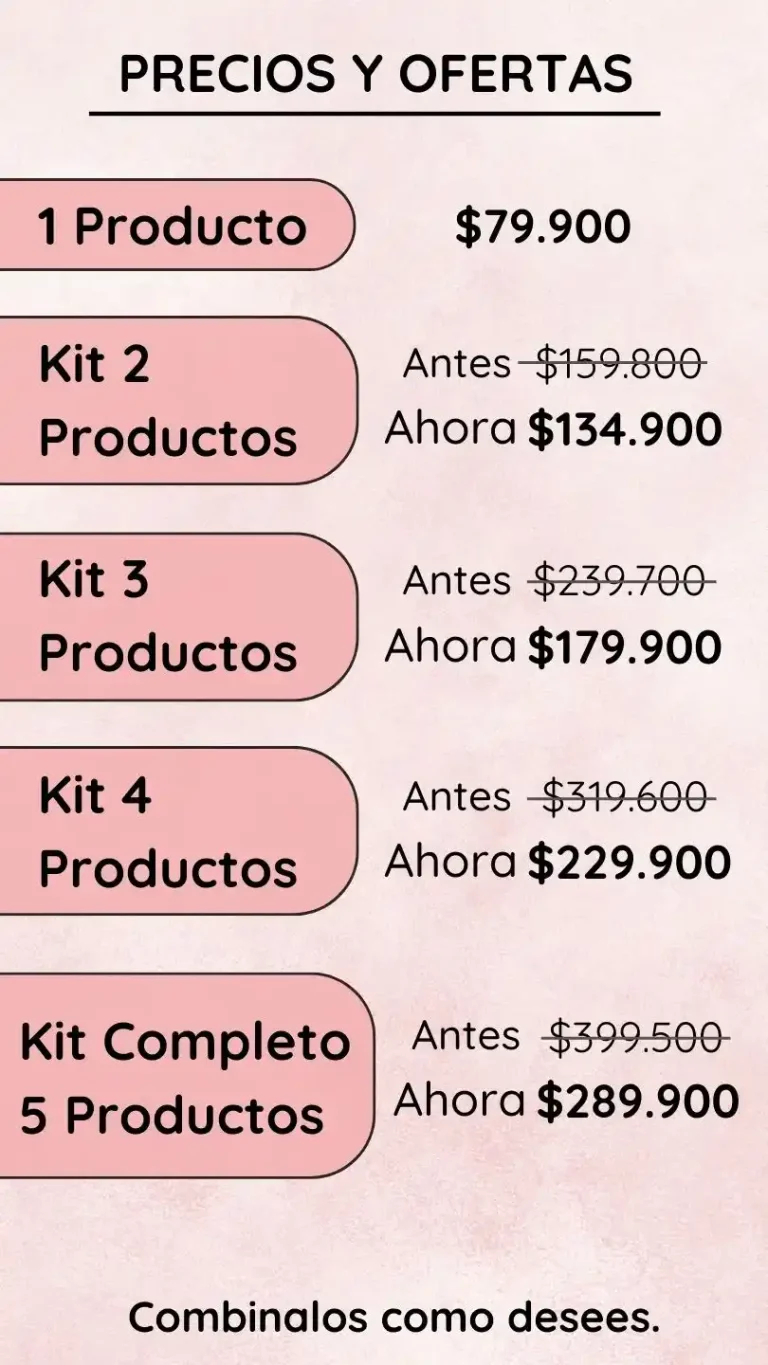 Nuestra colección profesional, diseñada desde mi experiencia en belleza, ofrece kits X2, X3, X4, X5 y individuales con obsequios gratuitos. El Kit Facial Profesional incluye Jabón Limpiador, Serum Antienvejecimiento, Óleo, Contorno de Ojos y Protector Solar, los puedes combinar como desees, proporcionando una rutina completa y efectiva.